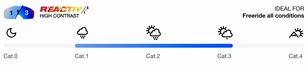 De REACTIV 1–3 High Contrast lens reageert continu op veranderende lichtomstandigheden en beweegt mee met het tempo van je dag. Dankzij het fotochromatische bereik van categorie 1 tot 3 kleurt de lens automatisch mee van licht tot donker, afhankelijk van de intensiteit van het omgevingslicht. Of je nu in fel zonlicht boven de boomgrens rijdt, door diffuus licht in open terrein skiet of het bos induikt waar schaduw en contrast elkaar afwisselen: de lens past zich zonder tussenkomst aan.