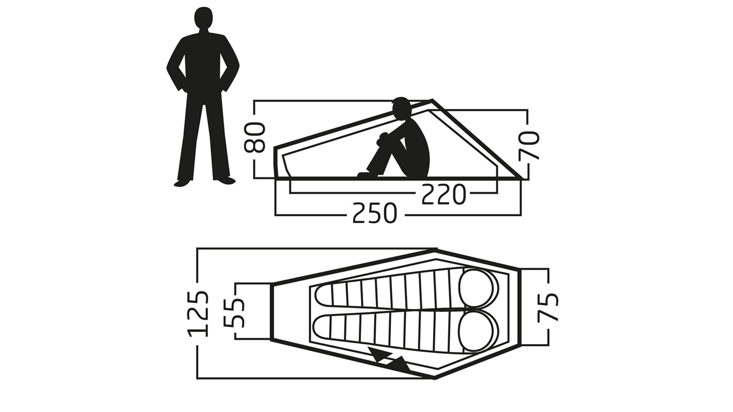 Je kunt er niet fatsoenlijk inklimmen en met twee wordt het al helemaal een drama om over elkaar heen te klimmen als er een naar het toilet moet. Je kunt op geen enkele wijze zo liggen dat je niet het tentdoek raakt, niet met twee, maar ook niet met een persoon. We hebben de hele nacht als twee samengepropte mummies tegen elkaar aan gelegen en werkelijk geen oog dichtgedaan. Hij is te laag, te kort, te smal en de ingang te klein voor twee personen. Ook is er nergens ruimte voor spullen, behalve onder je hoofd. Geen ruimte tussen binnen- en buitentent en niet in de binnentent, nergens.