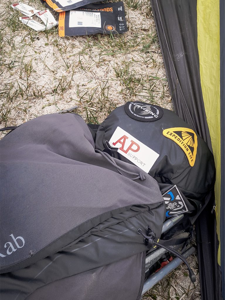 Ik draag tentje, slaapzak, mat, kookspullen, regenkleding, droge set kleding, boeken, een pot oploskoffie en enkele maaltijden in de rugzak. In het ene zijvak zitten walking poles, tentstokken en een flesje water. In het andere zijvak vrot ik de (natte) tent van 830 gram. Het voorvak propte ik vol met sportreepjes. In het kopvak zit kleingoed.