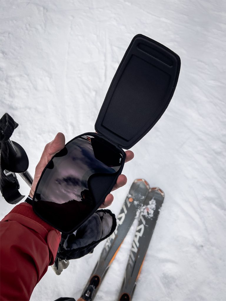 De tweede lens wordt geleverd in een pouch die in de binnenzak van een ski jas past. Praktisch bij snel veranderende omstandigheden.